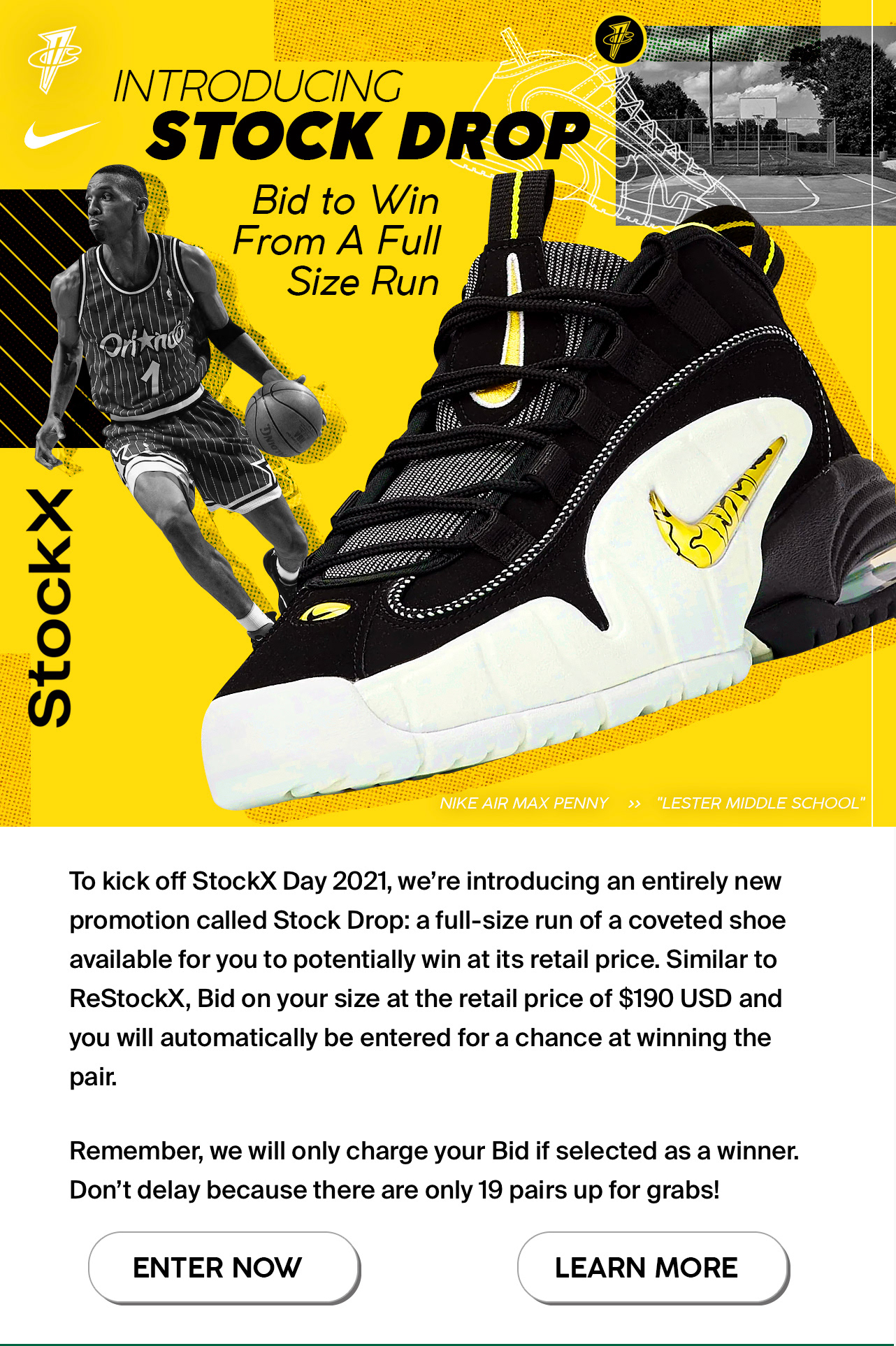 E-blast for StockX’s “Stock Drop,” featuring the Nike Air Max Penny. Bold typography, athlete-driven imagery, and product-focused visuals work together to create a high-impact layout designed to capture attention instantly and drive immediate engagement around the shoe release.